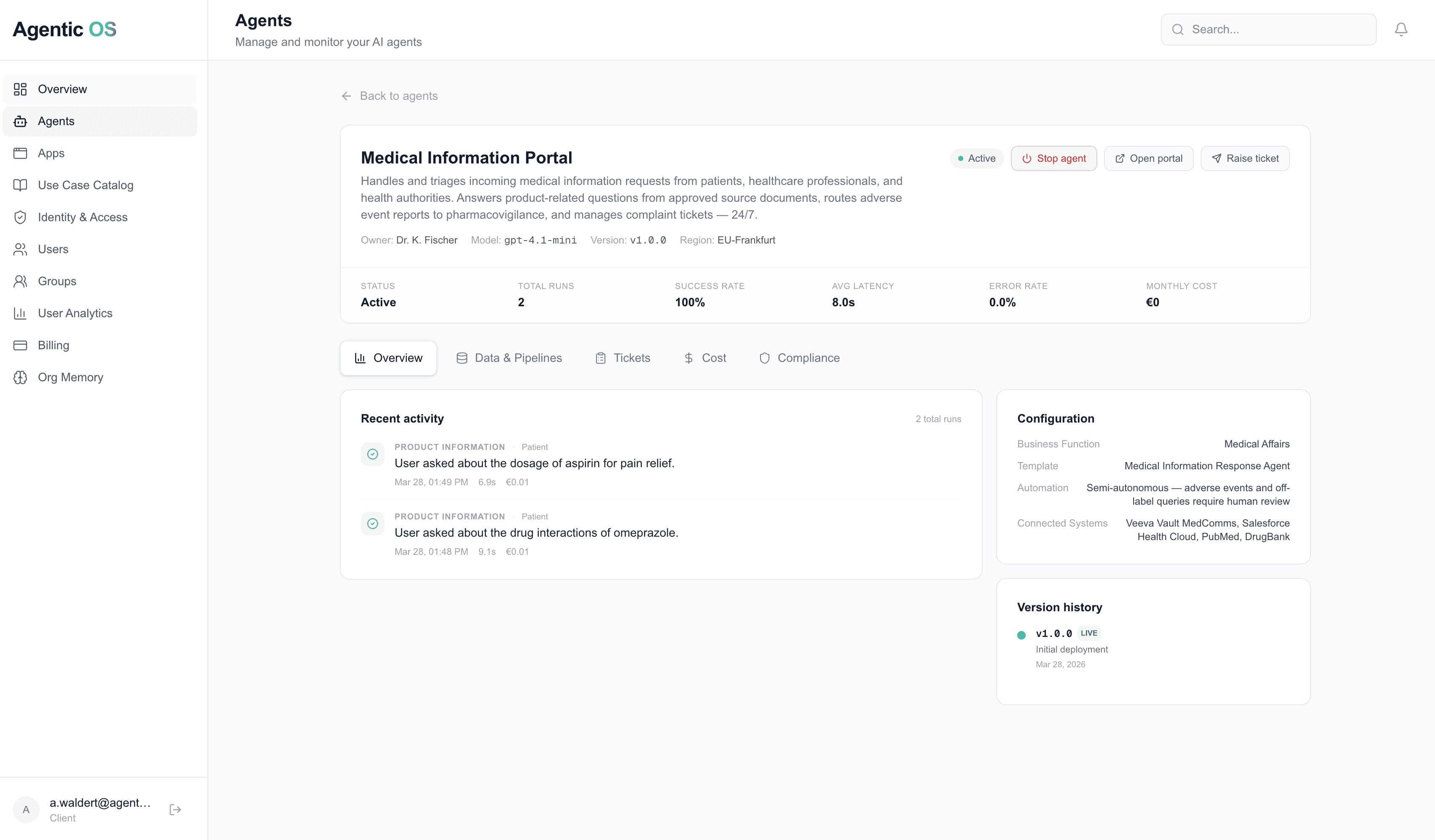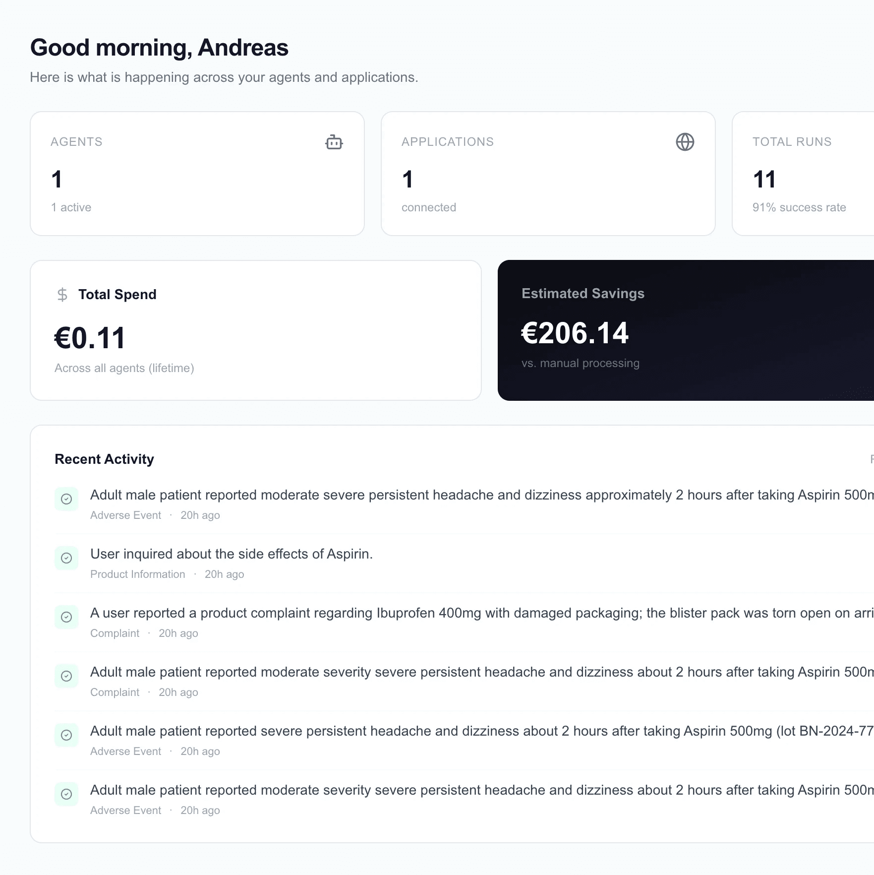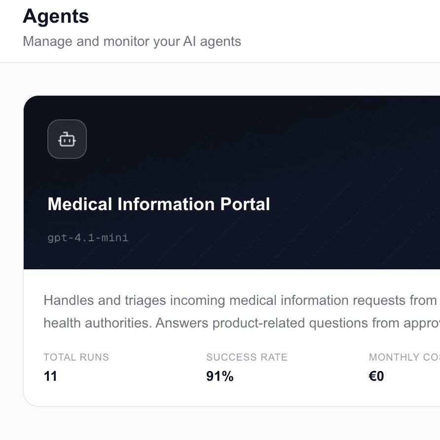 Yes. We're a German company and compliance is built into the platform architecture. All agent actions are logged and auditable. Data processing stays within your environment. We design every solution to meet European data protection and AI regulation requirements — not as an add-on, but by default.